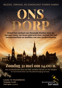 Heeswijk-Dinther – Muziekvereniging Servaes Dinther maakt zich op voor een wel heel bijzondere muzikale middag. Onder de titel ‘Ons Dorp’ presenteren het harmonieorkest, gemeentedichter Harold van der Heijden en zandtovenares Roos van Riet een unieke voorstelling waarin muziek, verhaal en beeld op indrukwekkende wijze samenkomen.